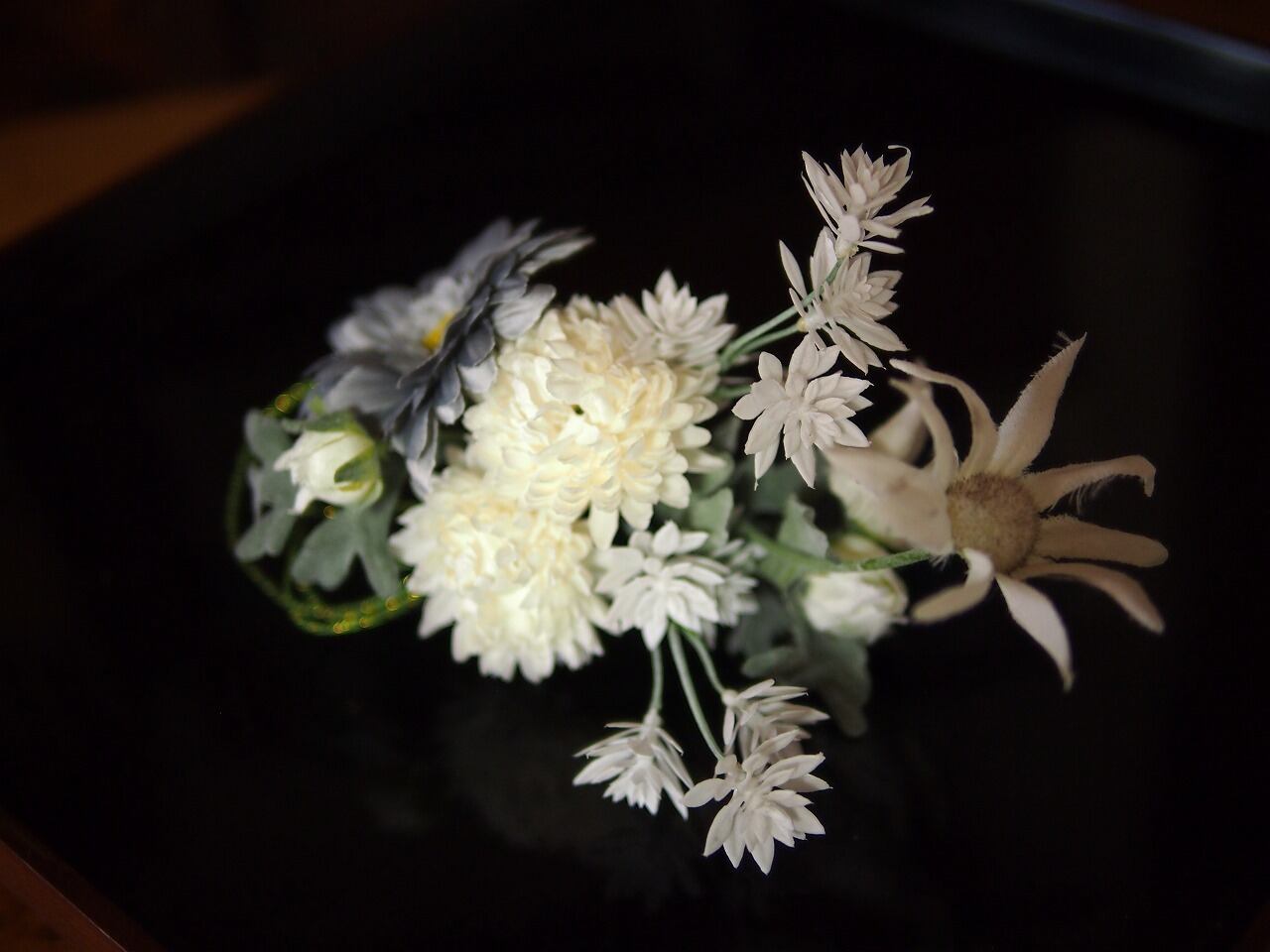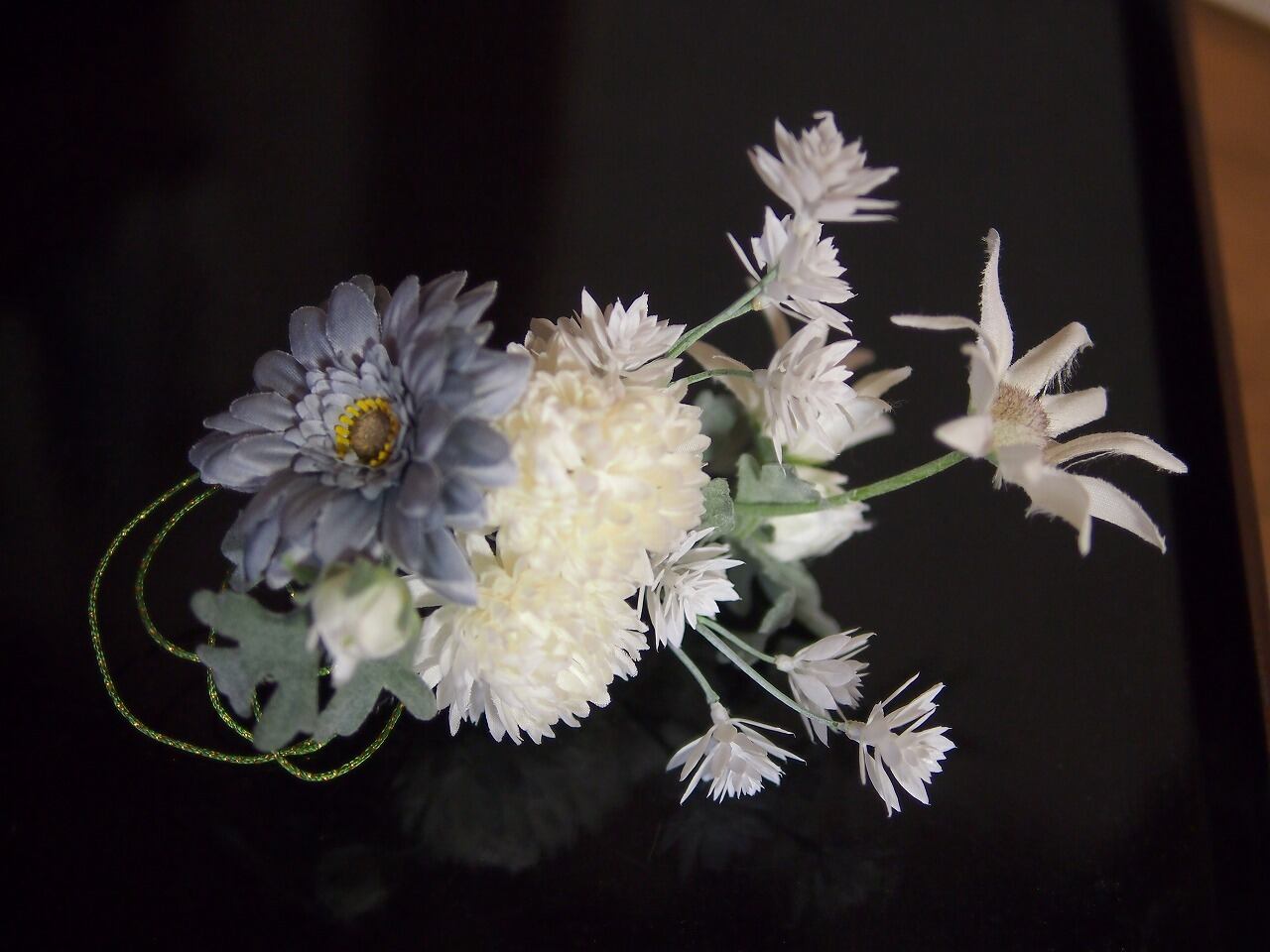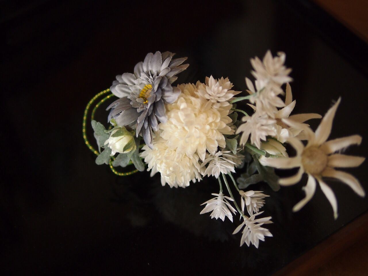 白い花のマーガレットとグレーガーベラ…に白い小花を合わせた上品な春らしい髪飾りになります。
